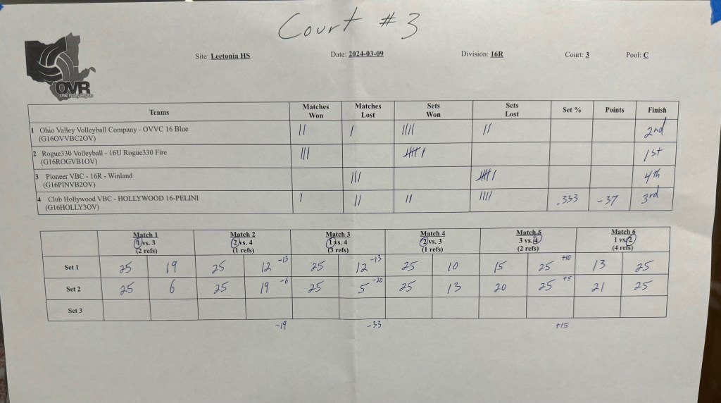 Rogue’s 16s went on to the Gold Bracket and faced a battle-tested team from Kidron VBC (Drost-Bachman) in a game we lost in two close sets. Kidron went on to finish second overall in Leetonia on Saturday, and proved too much for us. We look forward to a rematch in Sandusky!
