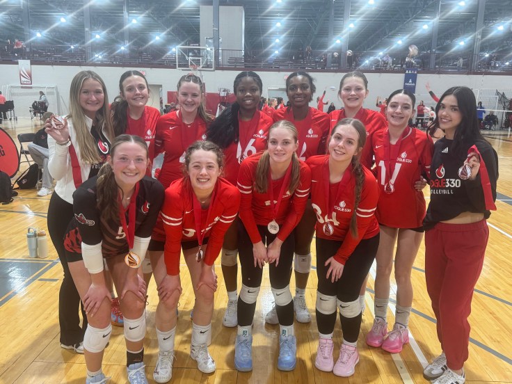 Last but not least, Coach Kaleigh Courtock’s Rogue330 17 BLAZE came close to winning their whole tournament. After winning their first four games in convincing 2-set fashion, the BLAZE came within a few points of beating the eventual tournament champion (FLB 17s) in a dramatic 3-set match for the ages. The BLAZE finished 3rd in GOLD but flashed the kind of potential and performance that will have them chasing more medals throughout the season. Led by Captains Ruthie Weimer (GlenOak) and Summer Brown (Lake Center), the BLAZE looked unbeatable, fearless, and fulfilled the entire time in Geneva. The BLAZE didn’t waste any time building off of last season’s top-10 finish in the OVR, and it will be fun watching them learn to win even more together. We’ll end this post with a picture of the BLAZE and their 3rd-in-GOLD medals…